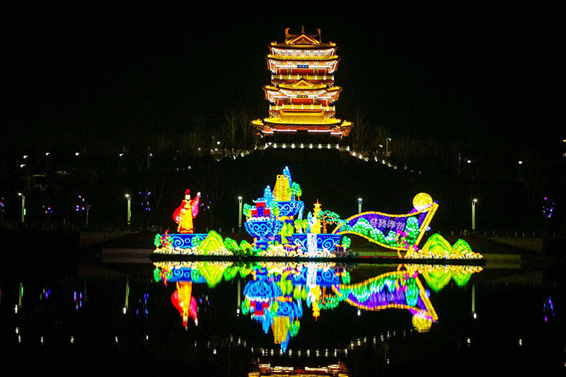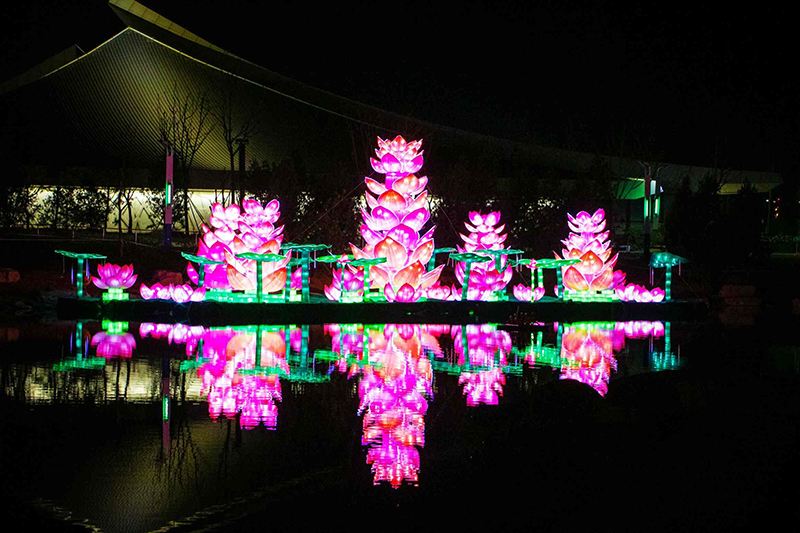 此次燈會布局以園博園南門、北門、東門為主展點,以園內園北路、園南路和中州路環形線路為主展區域,在同心湖上布置“鄭州風韻”、“秀美鄭州”、“荷塘月色”等大型水上燈組,呈現出波光粼粼,光影爛漫的唯美景象。眾多主題的燈廊、燈柱、燈雕畫廊將鄭州園博園打造成為流光溢彩、奇幻曼妙的彩燈世界。