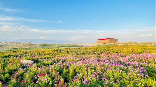 場地全線貫穿一條5米的風景道,形成室外游覽路線。五一水庫核心區(qū)以生態(tài)文明展示館為主體,包括以石榴籽為主體的中軸廣場、景觀蓄水池以及大面積的花海。在生態(tài)修復方面,選擇新疆本土植物,盡可能的打造具有新疆特色的純粹景觀。組合種植大面積花海和喬木林盤,模擬沙漠廣闊無垠的景觀意境。其中花海采用了紅葉地膚、格桑花、荷蘭菊等品種。生態(tài)文明展示館以“中國心”為主題,建筑的色調(diào)以紅色為主,展示生態(tài)文明建設的成果和博州的歷史文化特色。