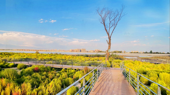 樹樹秋聲、山山寒色、秋光清淺、秋明空曠。漫步在水邊的木棧道上,置身花海叢中,遙望博樂市天際線,欣賞“落霞與孤鶩齊飛、秋水共長天一色”美景。
